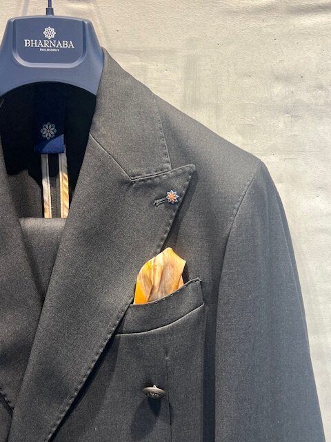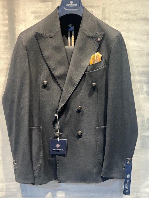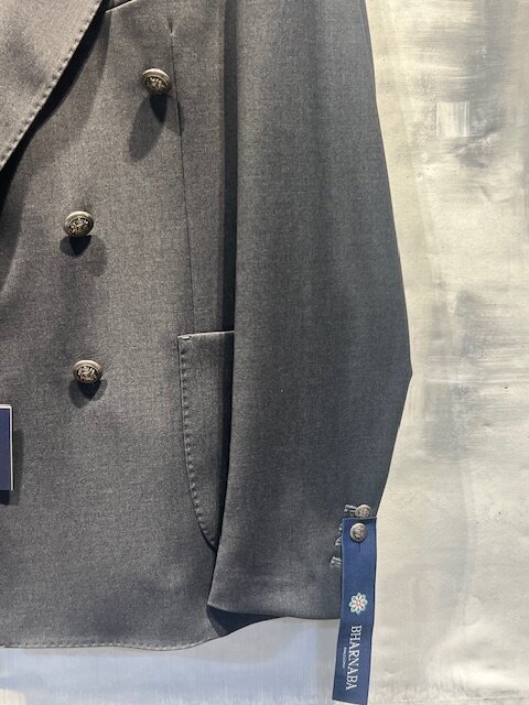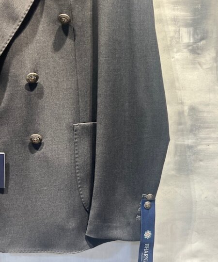 Abito doppio petto semi-sfoderato, rever a lancia con impunture, tasche applicate, bottoni argento decorati con lo stemma di famiglia.