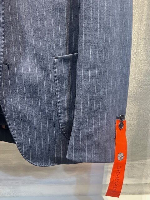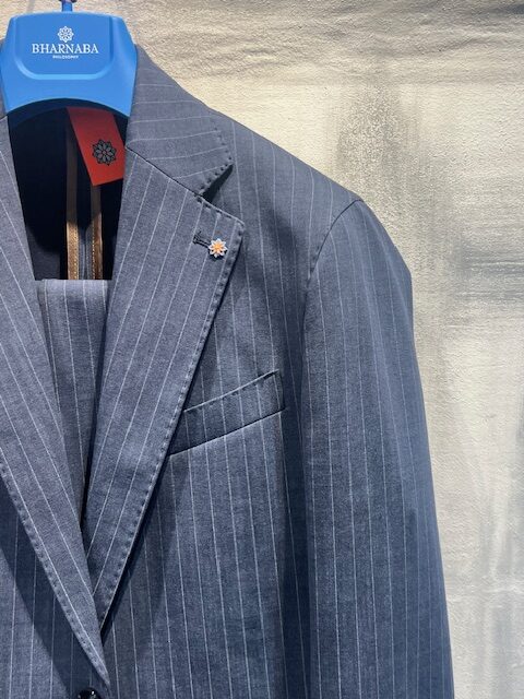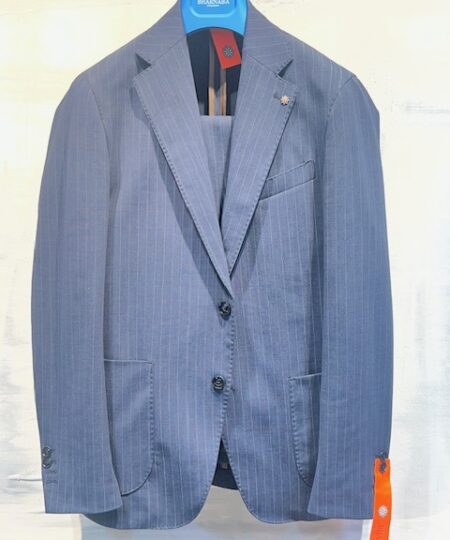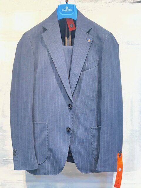Abito monopetto in jersey semi-sfoderato, gessato, rever con impunture, tasche applicate… pantalone slim a fondo 17.