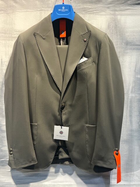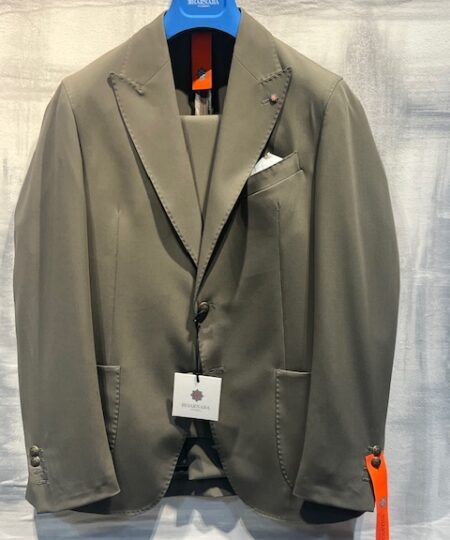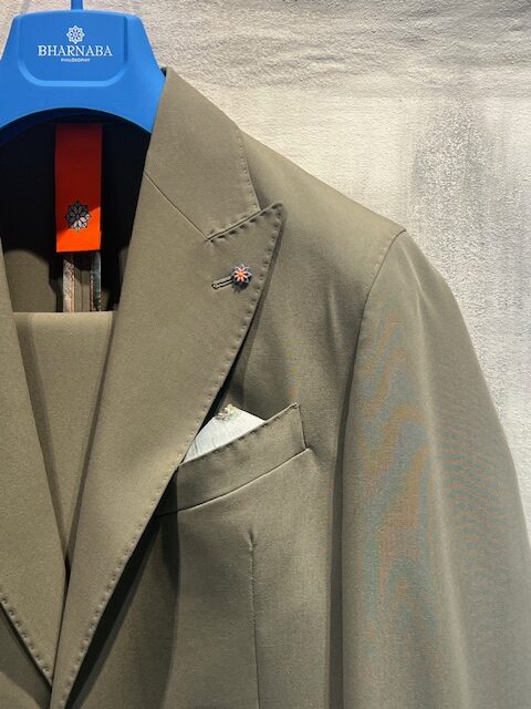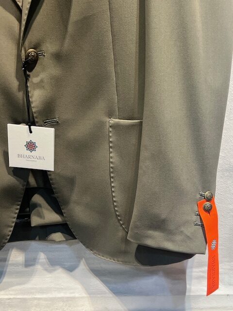 Abito monopetto sfoderato, rever a lancia con impunture, tasche applicate, bottoni lavorati con stemma dell’azienda.