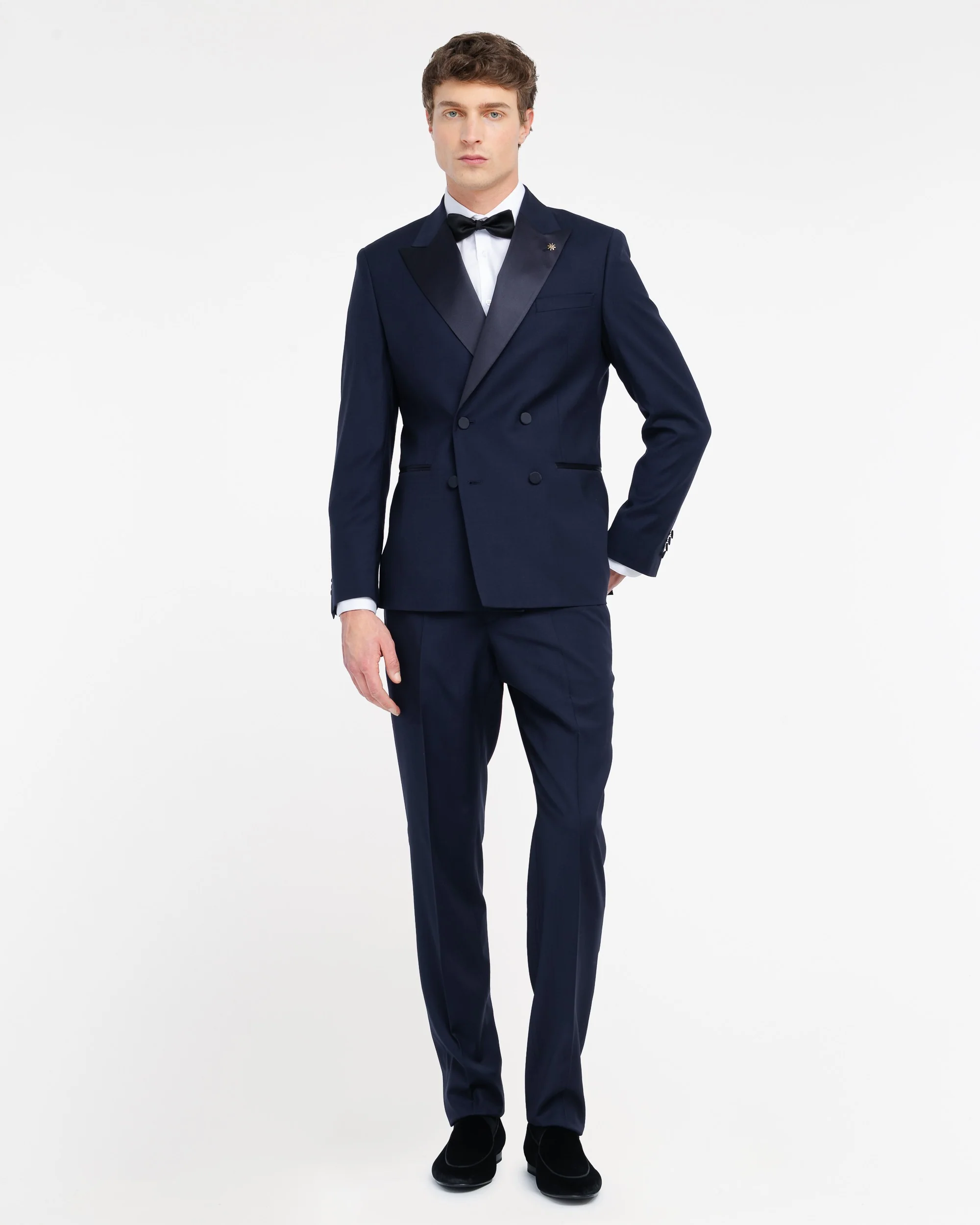 Abito doppiopetto, rever a lancia in seta, tasche a filetto, bottoni ricoperti