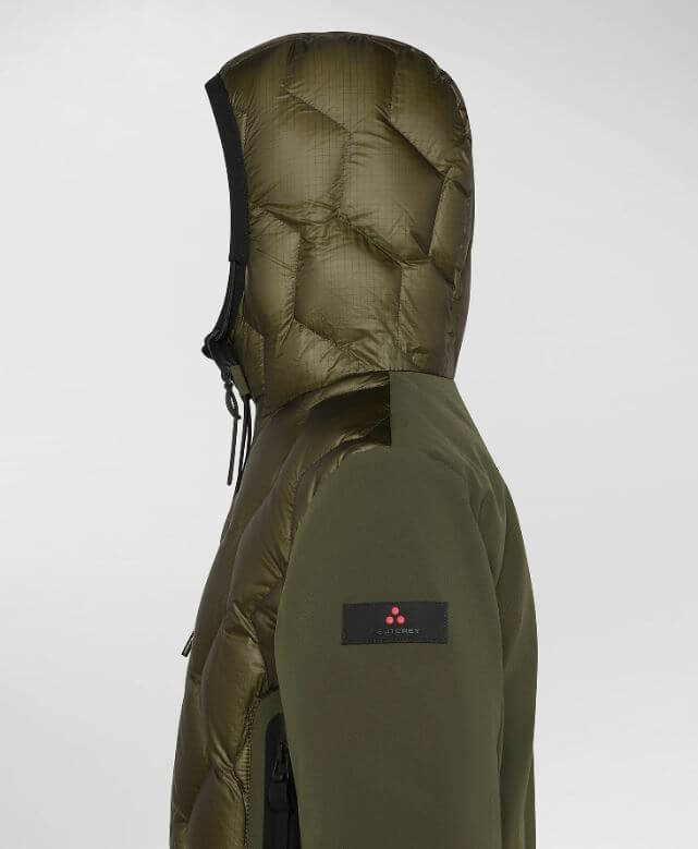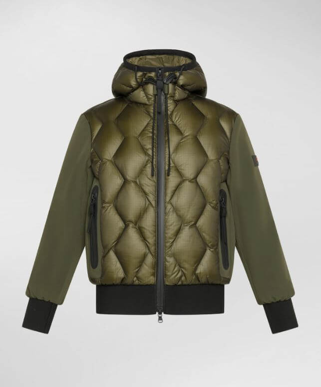 Bomber composto da due materiali tecnici: nylon ripstop 7den, superleggero e lucido e una tela di nylon stretch accoppiata con un jersey di nylon soffice e caldo, che garantisce appeal tecnico e una vestibilità ultra confortevole. Il design originale mostra un fronte capo con trapunta geometrica a rombi mentre maniche e retro sono lisce. Polsini e fondo in maglina nera elastica. Ne deriva un capo altamente di tendenza, adatto a chi non ama passare inosservato. I dettagli stilistici ed estetici confermano l’anima urban di questo capospalla che si caratterizza per: full zip centrale con doppio cursore, cappuccio fisso regolabile, imbottitura in piuma naturale certificata, due ampie tasche laterali con zip termosaldate. Downproof e idrorepellente. Un capo tecnico e originale per vestire di comfort e stile questa stagione fredda.