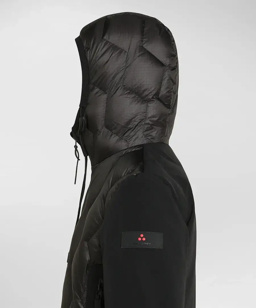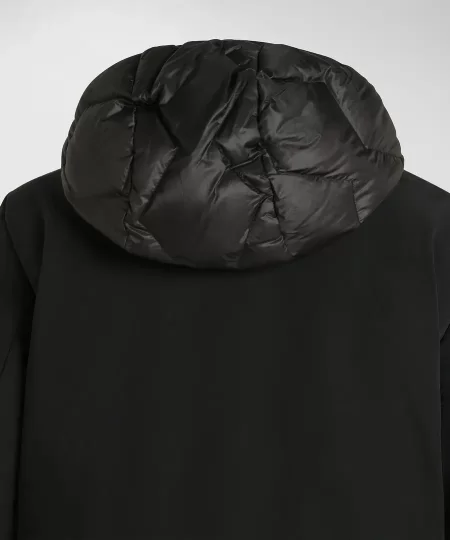 Bomber composto da due materiali tecnici: nylon ripstop 7den, superleggero e lucido e una tela di nylon stretch accoppiata con un jersey di nylon soffice e caldo, che garantisce appeal tecnico e una vestibilità ultra confortevole. Il design originale mostra un fronte capo con trapunta geometrica a rombi mentre maniche e retro sono lisce. Polsini e fondo in maglina nera elastica. Ne deriva un capo altamente di tendenza, adatto a chi non ama passare inosservato. I dettagli stilistici ed estetici confermano l’anima urban di questo capospalla che si caratterizza per: full zip centrale con doppio cursore, cappuccio fisso regolabile, imbottitura in piuma naturale certificata, due ampie tasche laterali con zip termosaldate. Downproof e idrorepellente. Un capo tecnico e originale per vestire di comfort e stile questa stagione fredda.