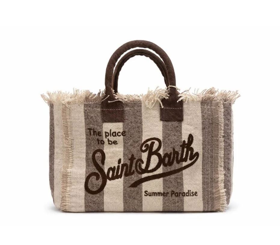 La Borsa Colette è realizzata in lino con struttura morbida e fantasia a righe verticali beige e bianche dal gusto naturale e raffinato. Il logo ricamato sul fronte aggiunge un tocco distintivo, mentre le frange laterali valorizzano il design con movimento e carattere. Perfetta per completare look estivi e da vacanza.