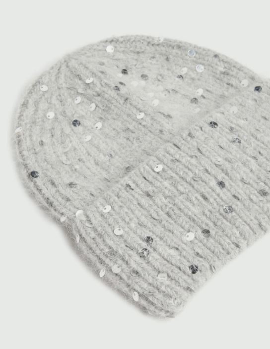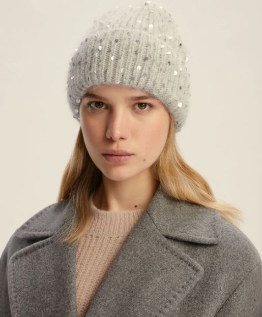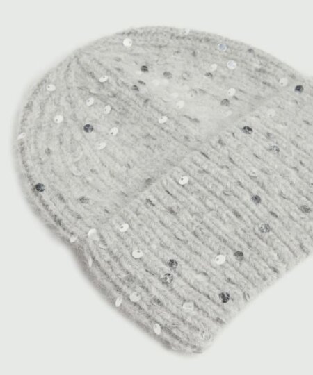 Protetta e scintillante, con il cappellino in maglia di misto angora dalla lavorazione a costa inglese. Le paillette nel filato aggiungono quella giusta nota glamour che eleva ogni look.