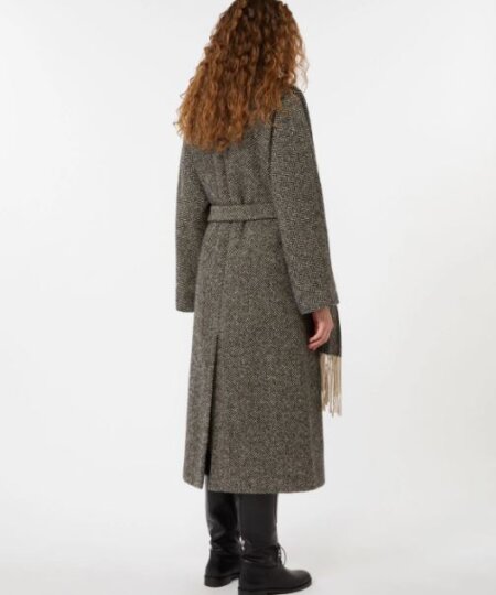Cappotto lungo a vestaglia, caratterizzato da sciarpa rimovibile in tessuto abbinato con motivo a frange sul fondo e label personalizzata.