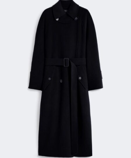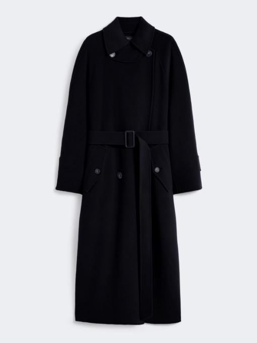 Cappotto lungo doppiopetto, caratterizzato da dettagli modello trench.
