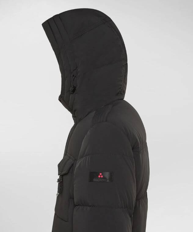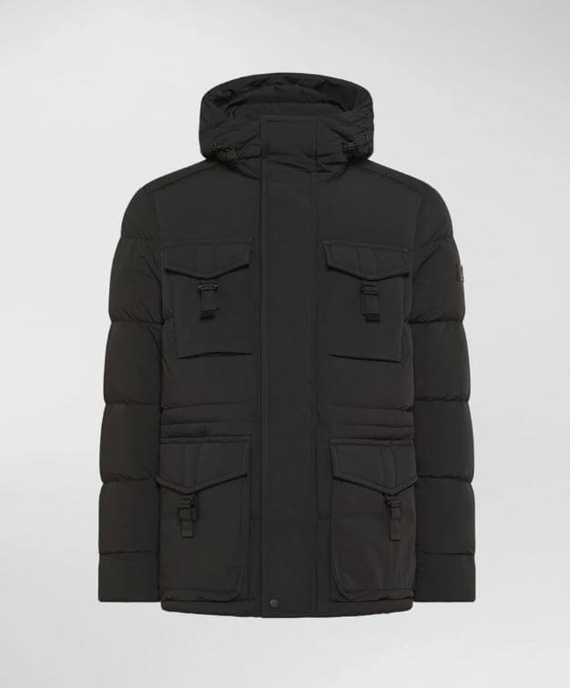 Field jacket in tela stretch realizzata in fibra cava di nylon opaco elasticizzato, che dona al capo comfort, leggerezza e allo stesso tempo volume. L’imbottitura in piuma naturale certificata garantisce un calore avvolgente e massimo comfort nelle giornate più fredde. Il design clean è arricchito da un cappuccio ergonomico e una zip centrale coperta da patta, mentre le quattro tasche frontali con chiusura a fibbia e i polsini antivento neri definiscono un look deciso e funzionale. Novità della linea Linea, i capi sviluppati all’interno di questo concept si distinguono per l’elevata elasticità dei tessuti, che li rende estremamente confortevoli, minimali nel design e altamente adattabili alle forme del corpo, ideali per uno stile essenziale che non rinuncia alla funzionalità. Il trattamento idrorepellente PFC Free assicura protezione dalle intemperie senza l’impiego di sostanze dannose per l’ambiente. Un capo che si fa notare per il suo stile urbano e contemporaneo, perfetto per chi vuole sentirsi protetto senza rinunciare ad un tocco di eleganza.