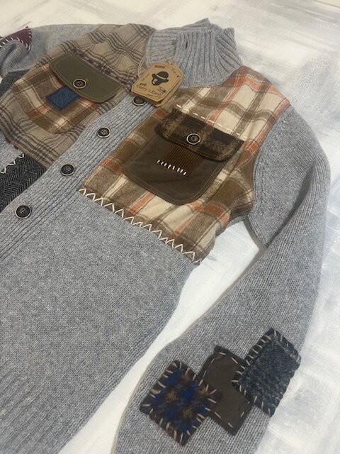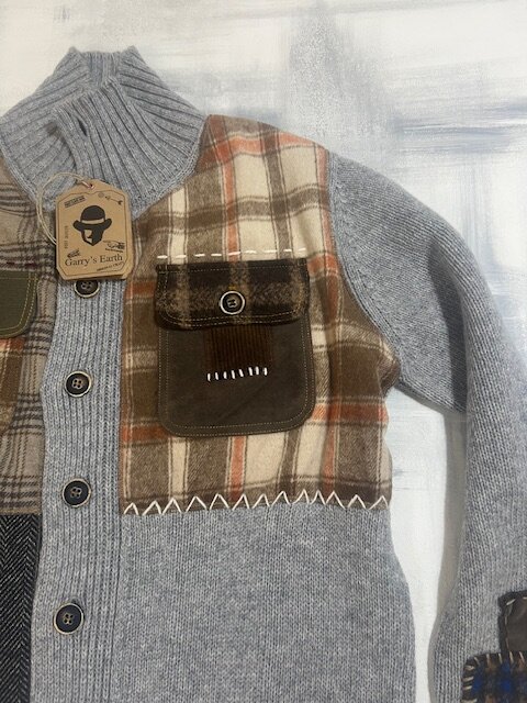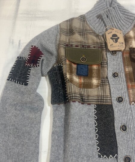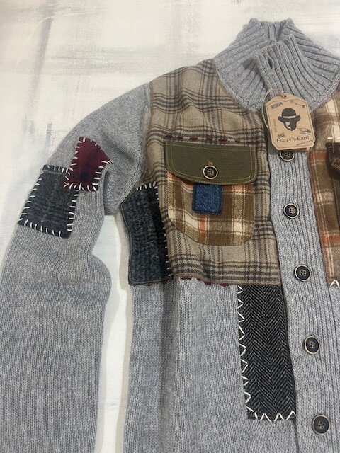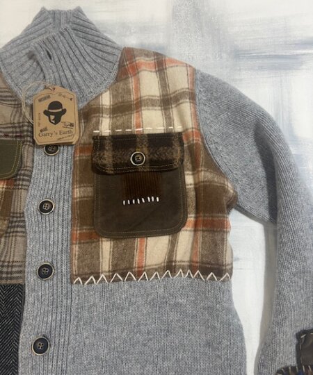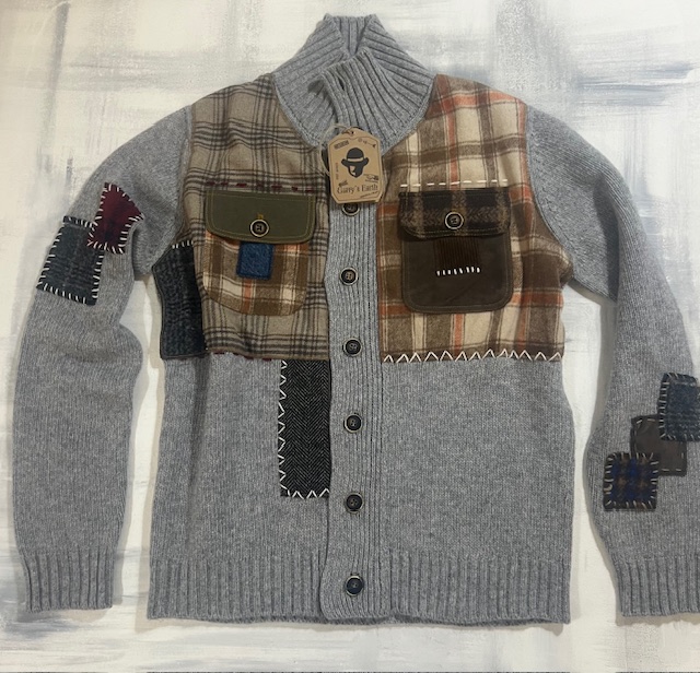 Cardigan Garry’s Earth di colore BLU in lana con inserti e patch, unico nel suo stile!