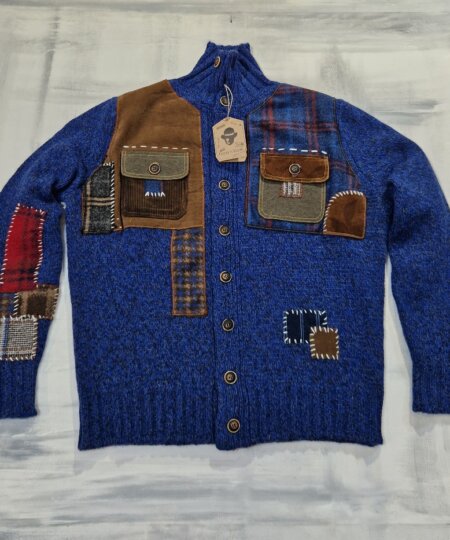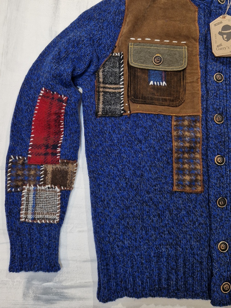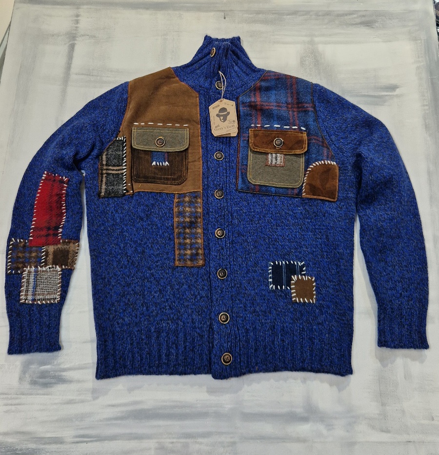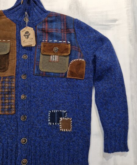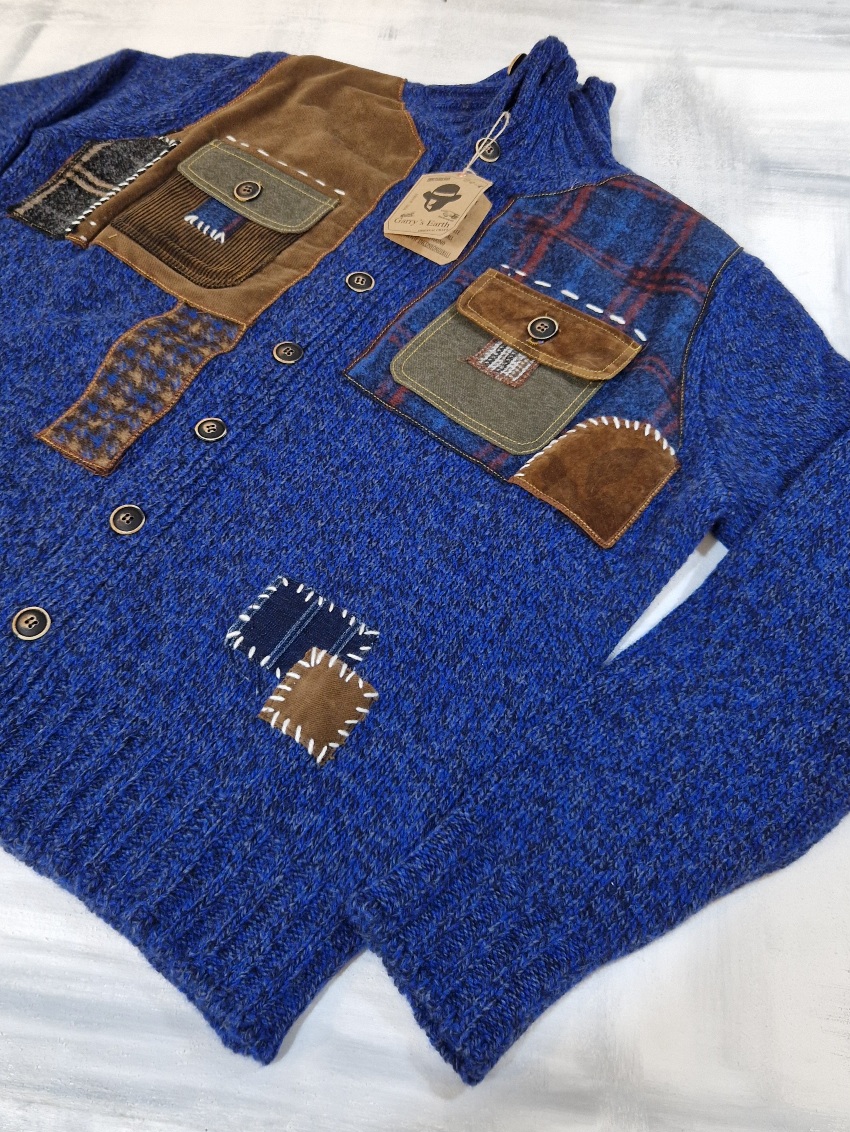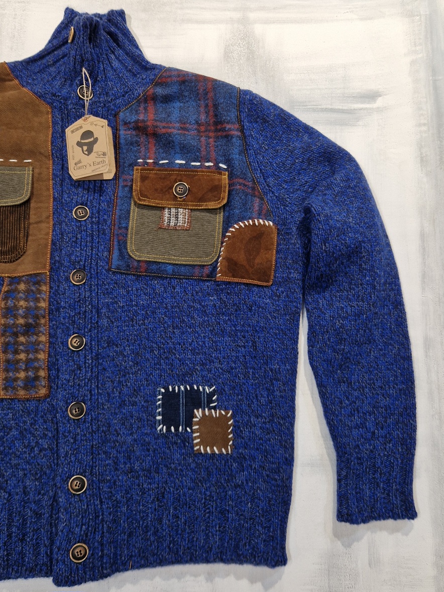 Cardigan Garry’s Earth di colore BLU in lana con inserti e patch, unico nel suo stile!