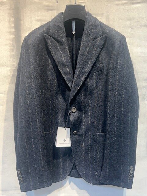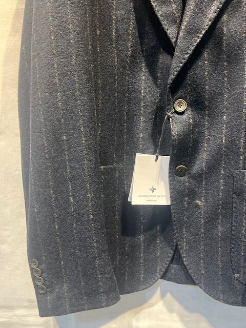 Giacca sfoderata Alessandro Gilles monopetto, rever a lancia, tasche applicate, gessata blu con righe cioccolato