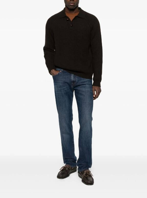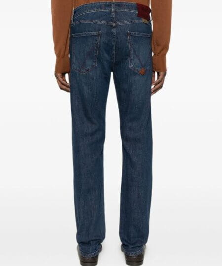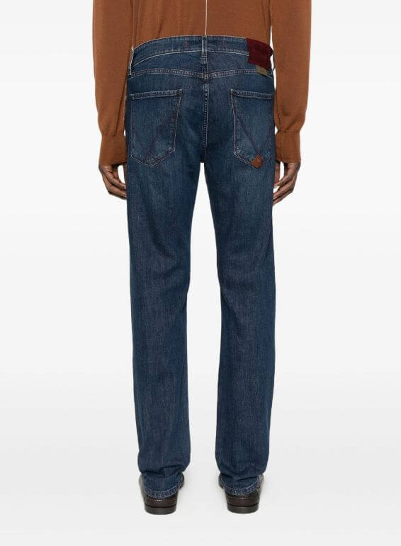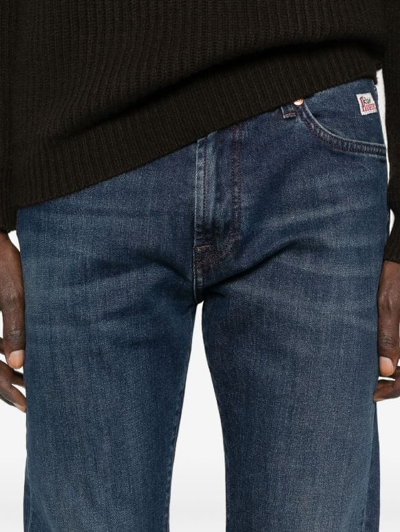 Jeans in denim washed con lavaggio scuro e leggere baffature sul fronte.