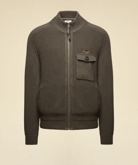 Una maglia spessa e confortevole caratterizzata da una pregiata lavorazione a costa inglese che le conferisce una texture ricca e soffice. Il design, simile a quello di una giacca, è reso funzionale dalla chiusura con zip e arricchito dal taschino sul petto con patta per un dettaglio distintivo.