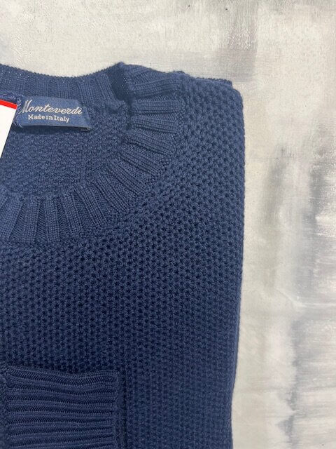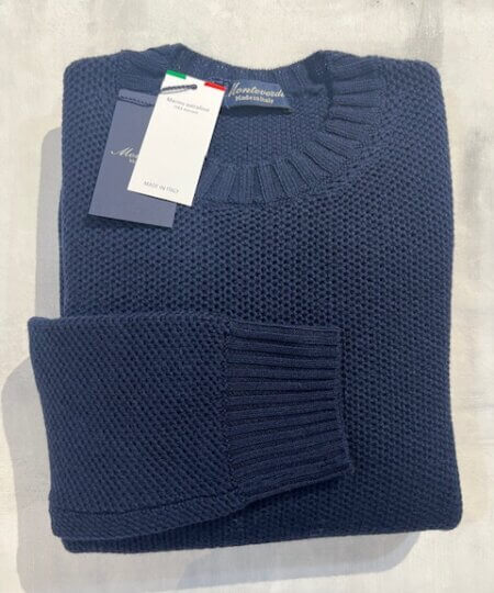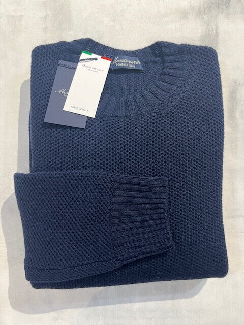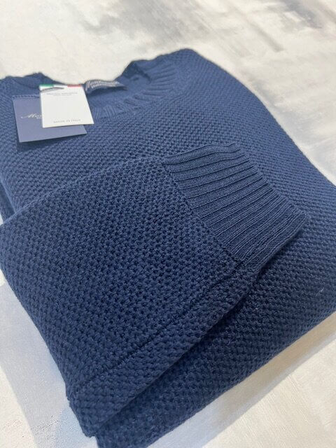 Maglione girocollo punto mimosa MONTEVERDI in 100% lana merinos extrafine col. Blu