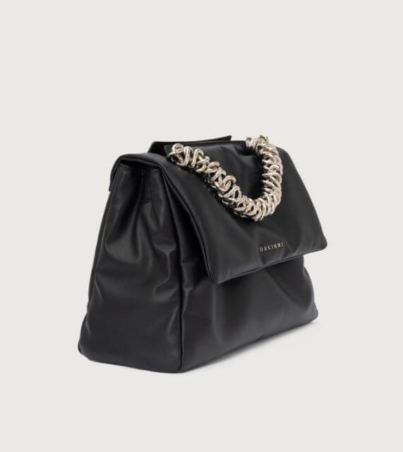 Funzionalità: apertura a scomparsa sulla parte alta della patta, manico in pelle e catena, tracolla regolabile removibile
