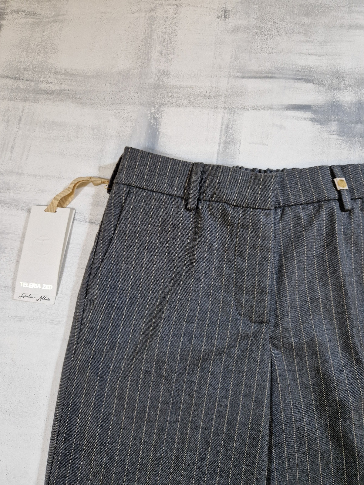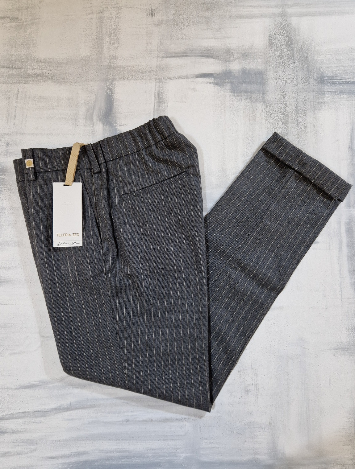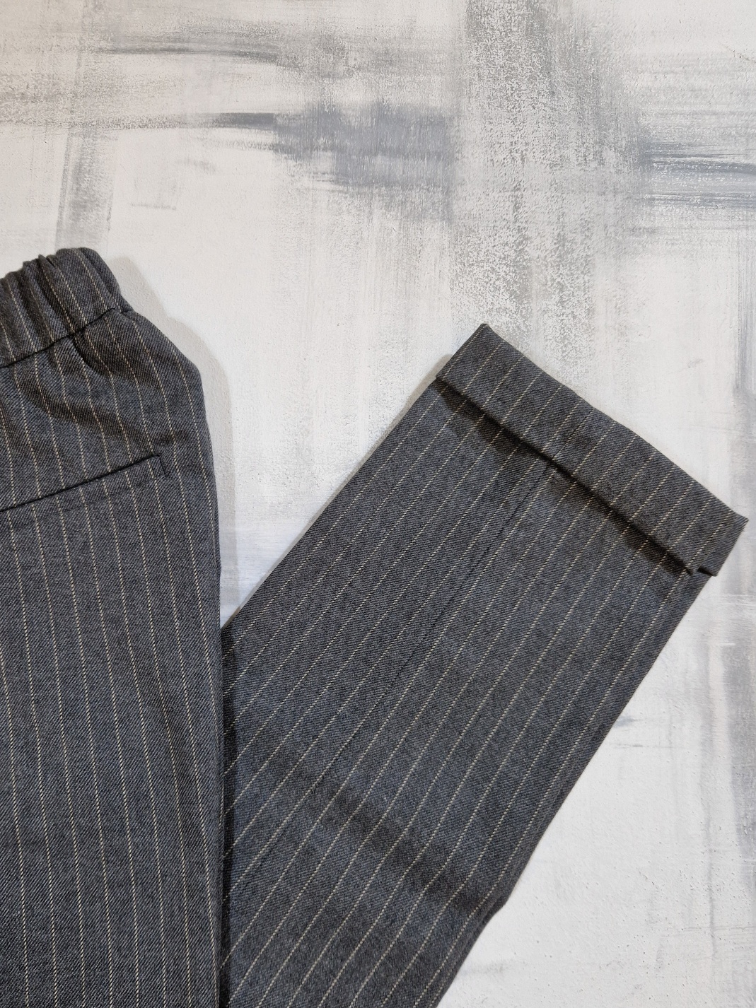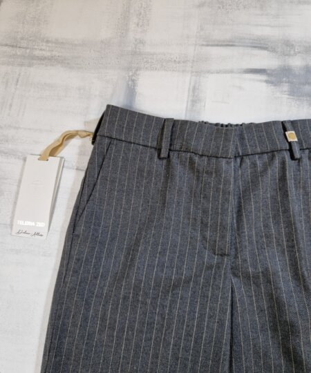 Pantalone gessato donna con elastico in vita, tasca francia sui fianchi, tasche a filetto sul retro, risvolto.