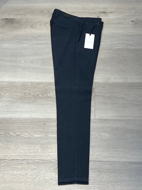 Pantalone Slim Fit, prolunga con bottone a vista, tirapancia con bottone, ventre piatto, cerniera, tasca francia, tasche anteriori a filetto.