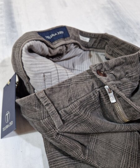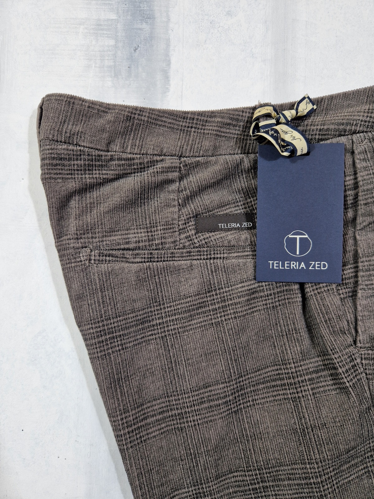 Pantalone Teleria Zed con pence, trama check scozzese, in velluto, tasca francia sui fianchi e tasche a filetto sul retro.
