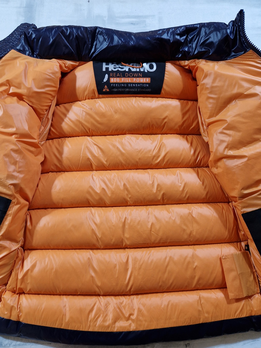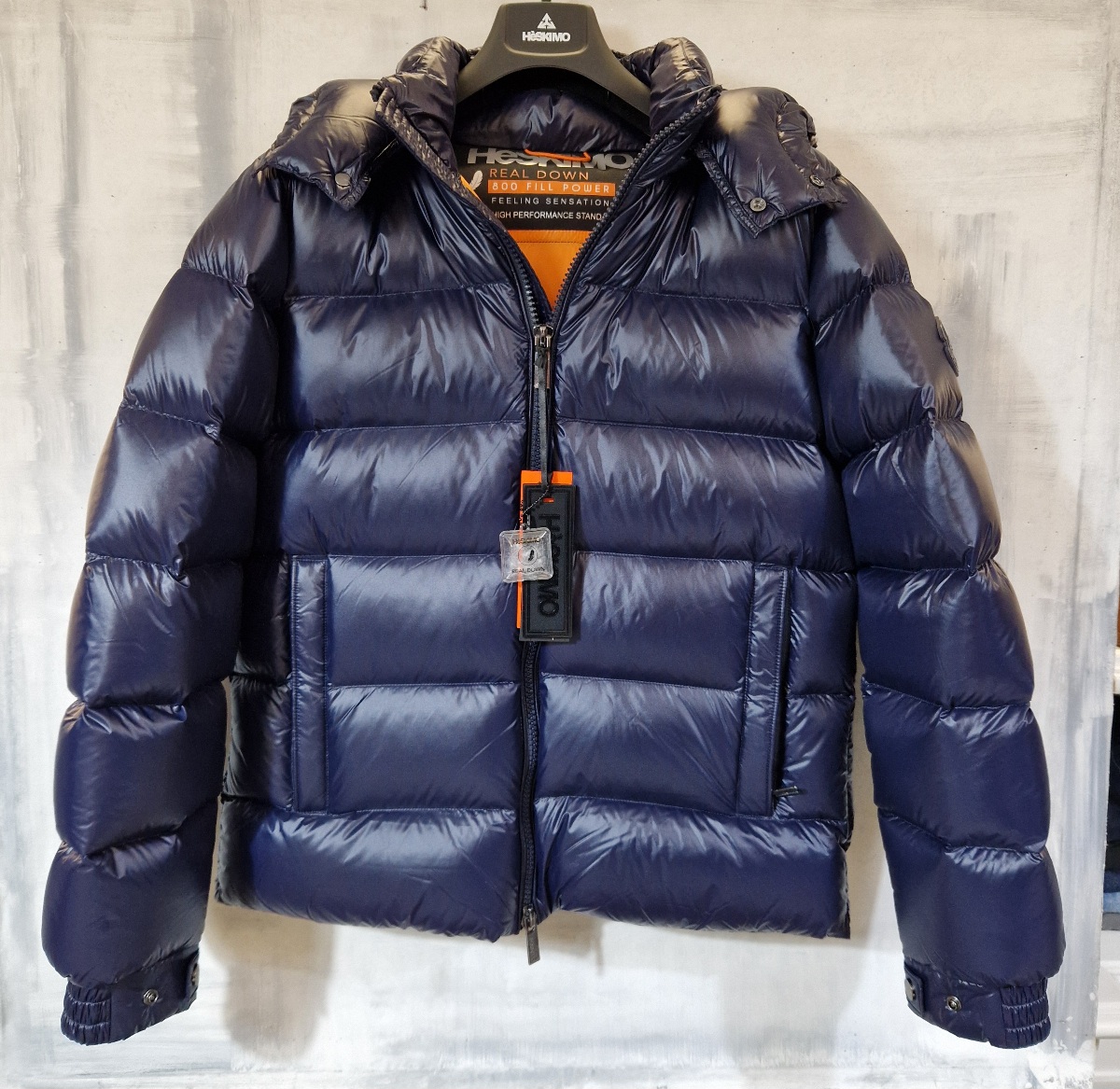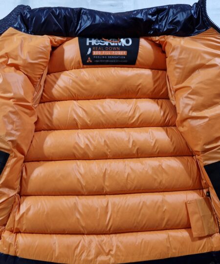 Piumino Bomber HESKIMO imbottito in vera piuma con cappuccio staccabile BLU interno ARANCIONE
