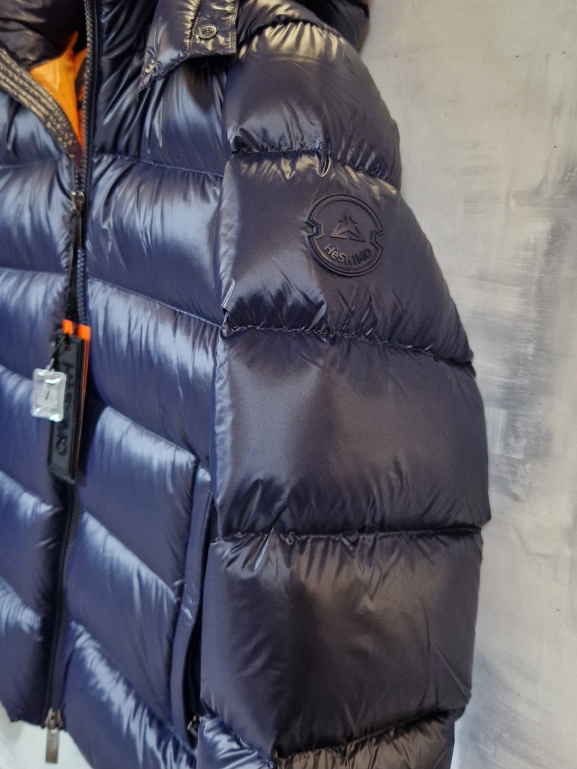 Piumino Heskimo imbottito invernale, puffoso, molto caldo, cappuccio staccabile, tasche con zip, interno a contrasto.