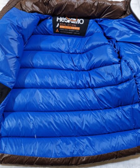 Piumino Heskimo imbottito invernale, puffoso, molto caldo, cappuccio staccabile, tasche con zip, interno a contrasto.
