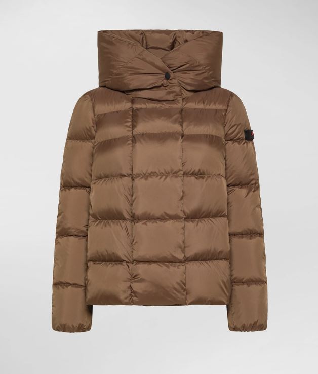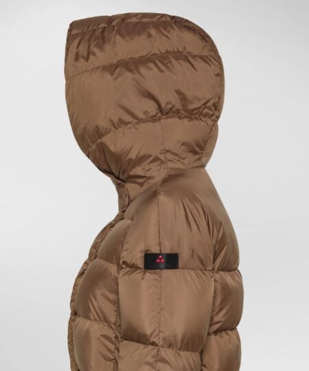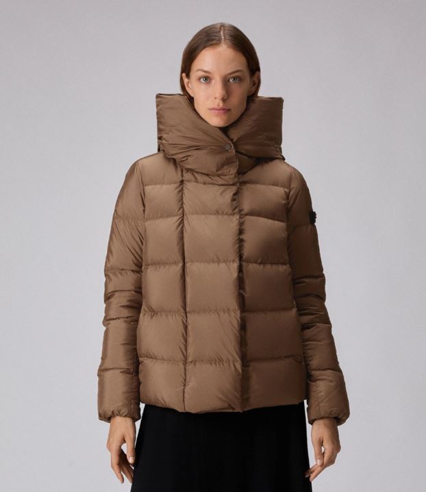 Piumino corto in tessuto superleggero, realizzato in 100% poliestere riciclato post consumo dalla mano morbida, struttura ultra compatta e finitura semi-opaca. L’imbottitura in piuma naturale certificata garantisce calore e leggerezza, mentre il trattamento idrorepellente PFC Free protegge dalle condizioni atmosferiche più variabili, nel rispetto dell’ambiente. La varietà dei dettagli fa di questo capo un must-have del guardaroba femminile di questa stagione: full zip centrale e bottoni a pressione nascosti da patta, tasche laterali a scomparsa con bottone singolo a pressione, ampio collo a scialle che avvolge dolcemente proteggendo dalle intemperie e cappuccio fisso. Un capo riconoscibile per il perfetto mix tra estetica, praticità e stile urban, adatto a chi vive con dinamicità, spaziando tra occasioni mondane e momenti informali.