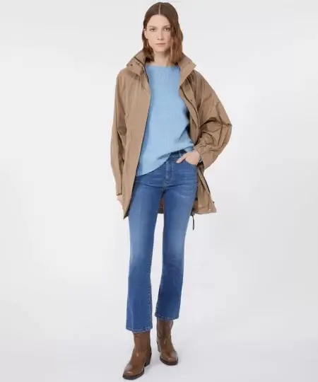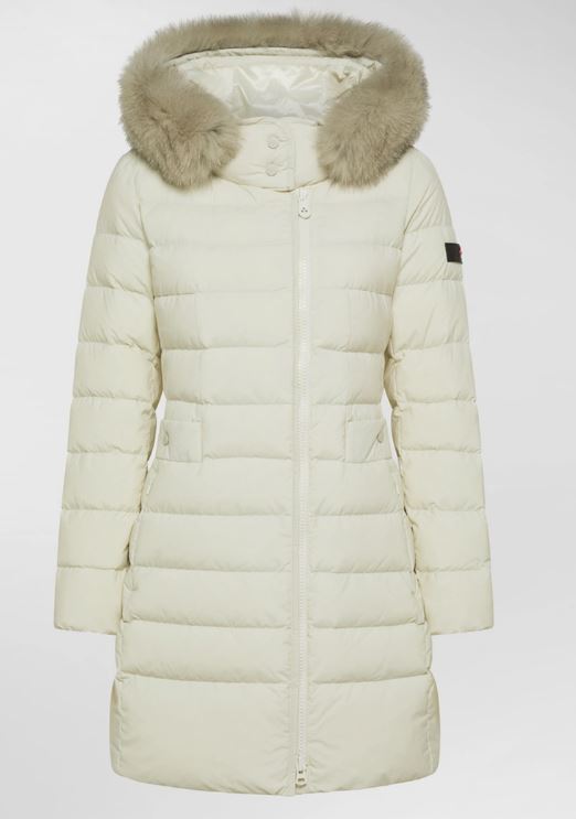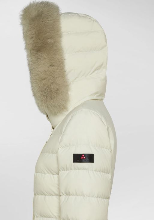 Piumino lungo trapuntato in leggero popeline di nylon e microfibra di poliestere, trattato ad alta temperatura per ottenere una mano sostenuta e un tatto polveroso, poi reso estremamente morbido grazie a un finissaggio al silicone. L’imbottitura in piuma naturale certificata assicura protezione termica con leggerezza, mentre il trattamento idrorepellente mantiene il comfort anche in caso di pioggia leggera. Il design è definito da una zip centrale a doppio cursore, collo avvolgente con bottoni a pressione tono su tono e cappuccio con bordo in pelliccia di volpe, removibile. Le tasche laterali con bottone a pressione completano un capo raffinato e funzionale, perfetto per l’inverno in città. Un modello iconico del brand, reinterpretato con dettagli moderni ed ancora più raffinati.