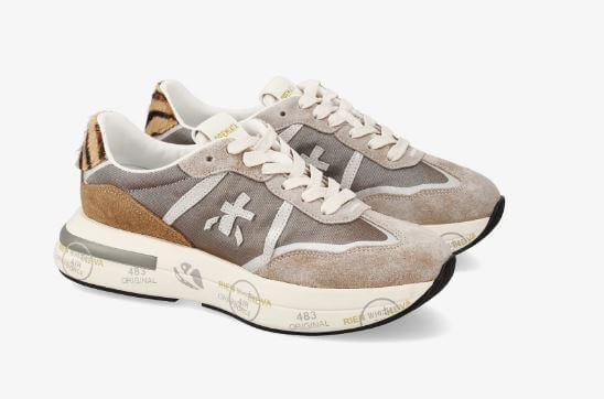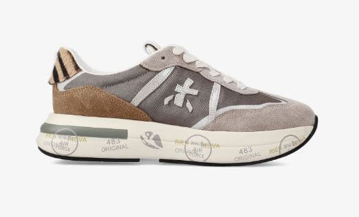 Sneakers grigia in suede e tessuto mesh con tallone animalier in cavallino. Logo laterale. Patch logo sulla linguetta. Soletta in vero cuoio estraibile. Suola over in gomma che riporta i classici motivi del marchio Premiata.