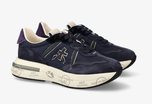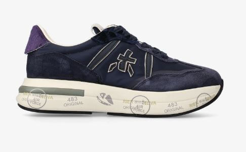 Sneaker Premiata in tessuto e pelle scamosciata blu scuro con logo e dettagli bianchi sul lato. Suola chiara con timbri caratteristici del brand. Perfetta per un look casual e moderno.