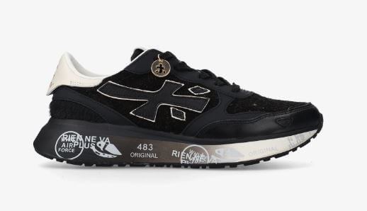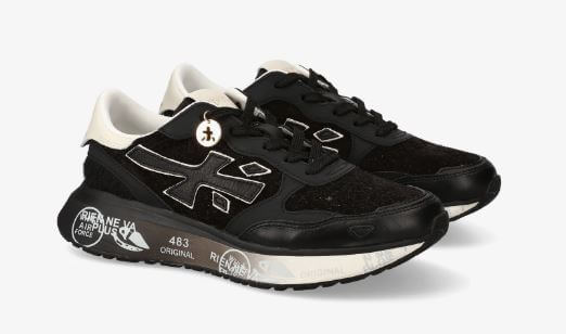 Sneakers Lauryn con tomaia realizzata in pelle nera e paillettes. Fondo platform personalizzato dalla serigrafia logata Premiata.