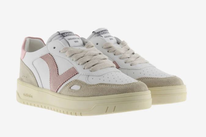 Scarpe sportive unisex in effetto pelle bianca con inserti colorati e in effetto casmocio. Contrastano la V di victoria laterale e il tallone con il logo del marchio in colori coordinati. Dettaglio a finestra sul lato. Punta traforata per favorire la traspirazione. Suola in TPR leggermente ambrata.
