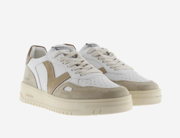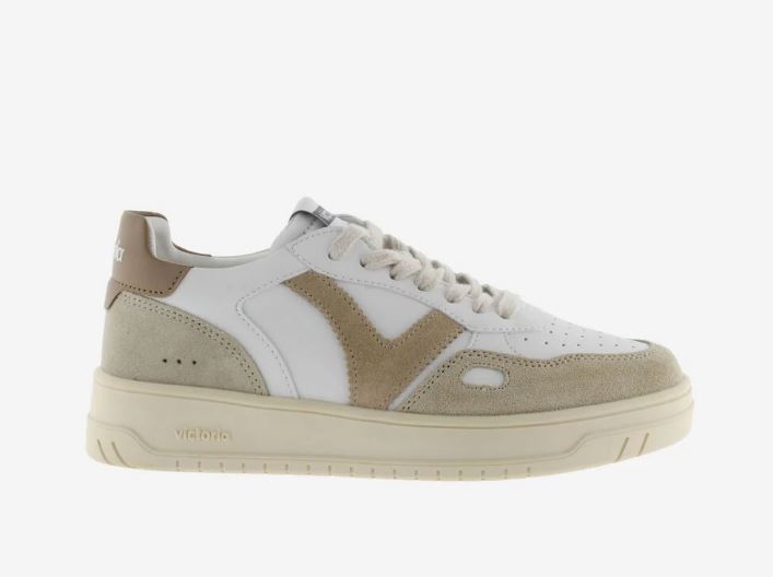Scarpe sportive unisex in effetto pelle bianca con inserti colorati e in effetto casmocio. Contrastano la V di victoria laterale e il tallone con il logo del marchio in colori coordinati. Dettaglio a finestra sul lato. Punta traforata per favorire la traspirazione. Suola in TPR leggermente ambrata.